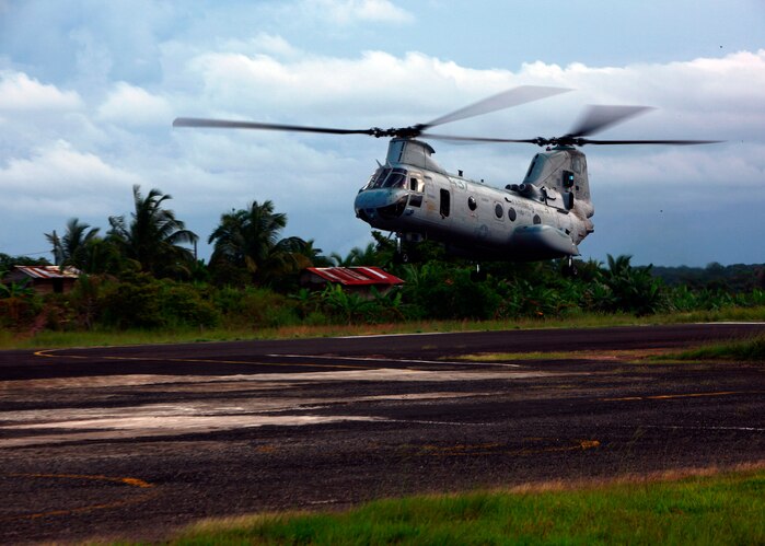 A CH-46E Sea Knight helicopter with Marine Medium Helicopter Squadron 774, attached to Special-Purpose Marine Air-Ground Task Force Continuing Promise 2010, prepares to land in Bluefields, Nicaragua, Sept. 21. Service members and civilians are deployed in support of Operation Continuing Promise 2010 providing medical, dental, veterinary, engineering assistance and subject-matter exchanges to the Caribbean, Central and South America.