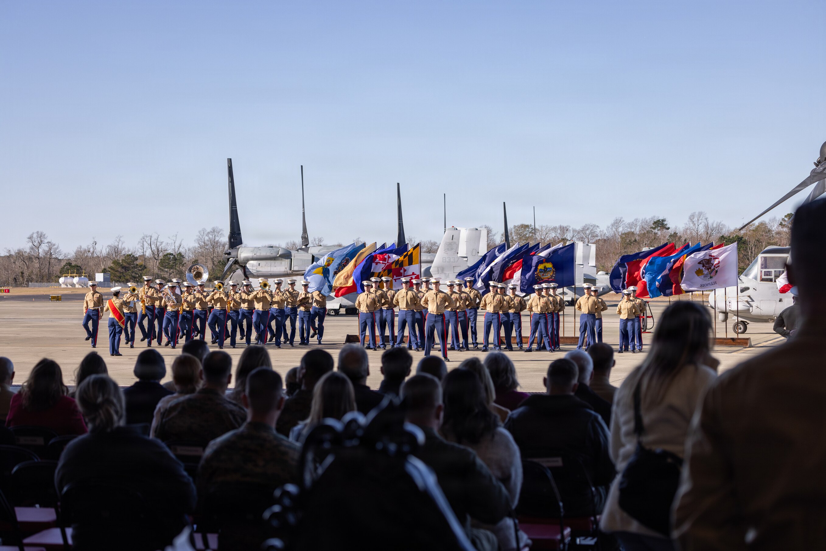 U.S. Marines with Marine Medium Tiltrotor Squadron (VMM) 264, Marine Aircraft Group 26, 2nd Marine Aircraft Wing, take part in a reactivation ceremony at Marine Corps Air Station New River, North Carolina, Dec. 11, 2025. VMM-264’s reactivation adds an additional MV-22B Osprey squadron to 2nd MAW and II Marine Expeditionary Force, providing additional assault support capability. (U.S. Marine Corps photo by Cpl. David Ornelas Baeza)